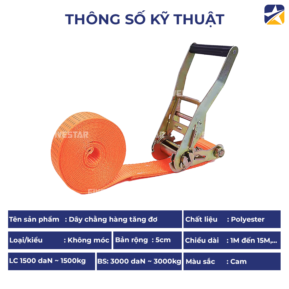 Sử dụng chất liệu dây đai polyester bản 50mm (5cm) từ FIVESTAR với tải kéo đứt là (BS: 3000kg). Chất liệu polyester cao cấp, dệt may chắc chắn, đảm bảo chịu lực tốt và hoàn toàn không co giãn.