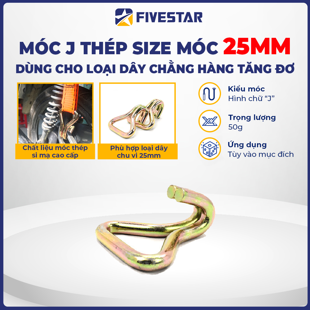 Móc J bản 25mm là chi tiết để sản xuất các sản phẩm dây ràng tăng đơ bản 25mm móc J với độ bền đặc biệt tại Fivestar Việt Nam chúng tôi cân nhắc sử dụng nguyên vật liệu thép công nghiệp để đảm bảo khả năng chịu tải của móc.